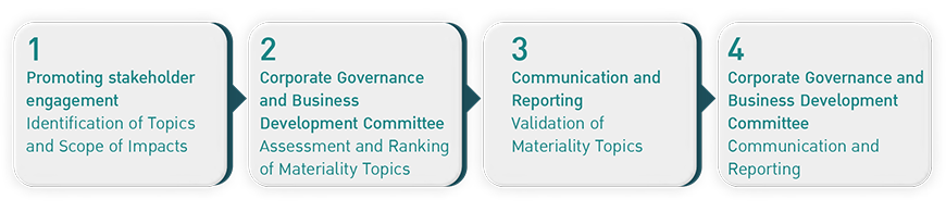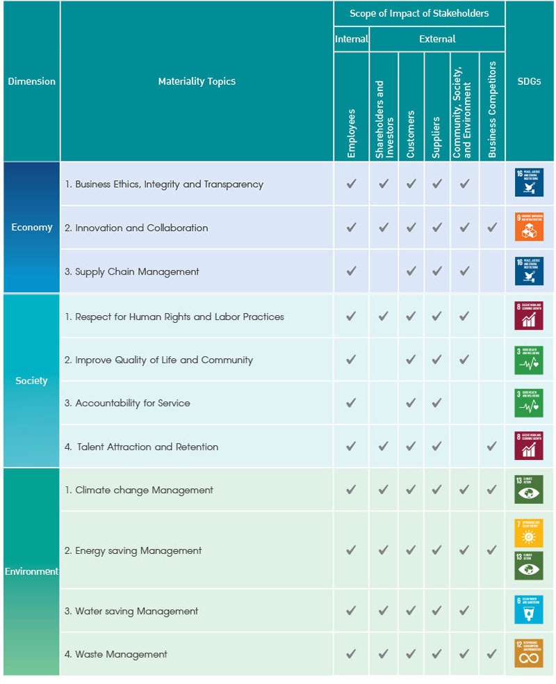 The Company conducts a thorough review of risks and opportunities based on the expectations and concerns of all stakeholder groups. This assessment considers the impact of each operational activity within the business value chain, industry trends, sustainability direction, emerging risks, and major global shifts. The analysis adopts a holistic approach, taking into account both internal and external factors that influence economic, social, environmental, and human rights aspects—both in terms of their impact on the Company and on stakeholders. This process follows the principles of the Global Reporting Initiative Standards (GRI Standards) and aligns with the Sustainable Development Goals (SDGs) . The Company prioritizes sustainability issues through a structured sustainability management framework, which includes: identifying key issues and impact scope, evaluating and prioritizing materiality topics, validating material topics, communicating and reporting on material sustainability issues. The preliminary material topics are reviewed by senior executives from the Sustainablility Development Working Group and the Corporate Governance and Sustainable Development Committee before final approval by the Board of Directors. The sustainability materiality assessment follows the process and steps as outlined below: