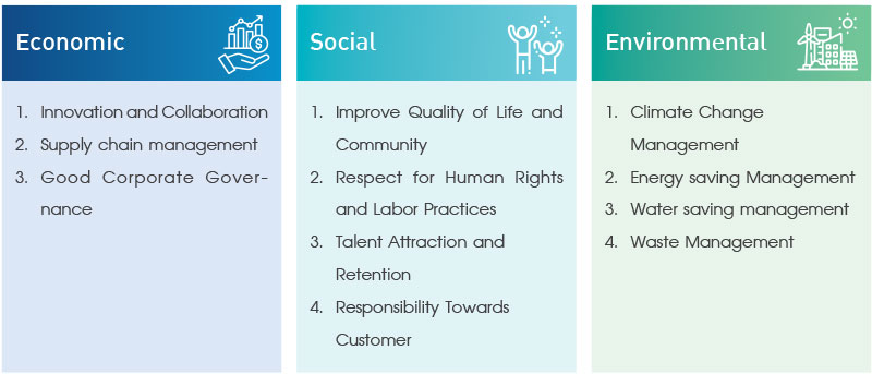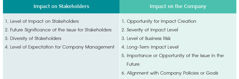 The Company prioritizes materiality topics by assessing the significance of economic, social, human rights, and environmental impacts on the organizational context and stakeholders. This assessment covers the scope of challenges, opportunities, strategies, and sustainability goals. All identified issues are ranked based on opportunities and risks, evaluated by their significant impact and likelihood in relation to the Company’s business and stakeholder concerns. This process aligns with indicators from the Global Reporting Initiative Standards (GRI Standards) and the United Nations' Sustainable Development Goals (SDGs) using the following criteria: