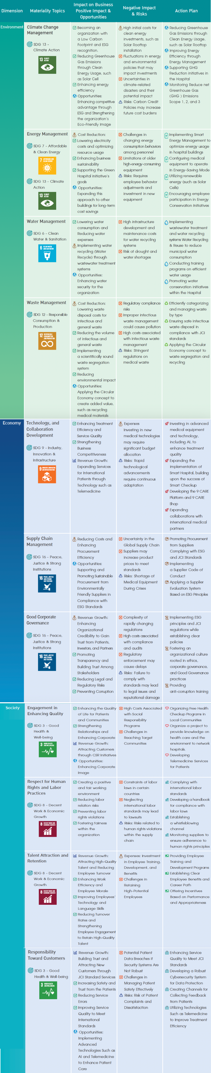 For the materiality topics of Praram 9 Hospital, priorities and action plans are determined, along with an analysis of both the positive and negative impacts of these key issues on the business. This includes considerations related to expenses, revenue, risks, and opportunities for business growth at Praram 9 Hospital. The analysis of materiality topics—Impact and Materiality Topics Analysis—enables a clear identification of opportunities and risks, as well as the development of appropriate action plans to promote sustainability while minimizing environmental and social impacts, as outlined below.