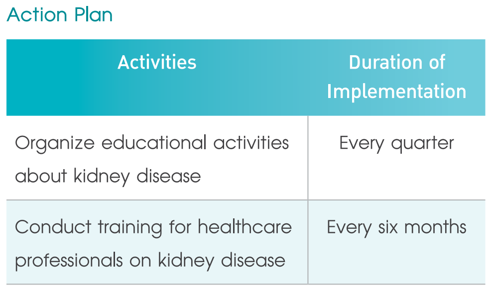1. Providing knowledge on kidney health care: Organize seminars and workshops for the "Healthy Kidney for All" project: Educate the public and companies about kidney health care and kidney disease prevention