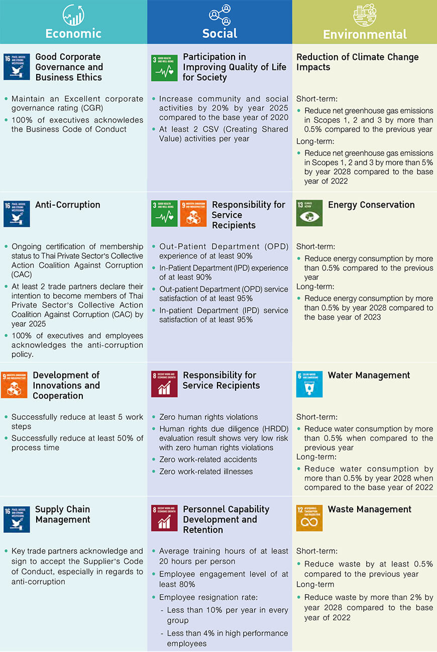 The Company conducts its business based on a balanced and inclusive approach to fostering growth for all stakeholders across economic, social, and environmental dimensions. This is achieved with a commitment to human rights principles, good corporate governance in accordance with international standards, and alignment with the United Nations’ Sustainable Development Goals: SDGs. The Company's sustainability development policy consists of fostering health innovation, promoting sustainable well-being, and maintaining environmental balance. These objectives are pursued through business processes that drive the creation of products and services that meet stakeholder needs in both normal and crisis situations. Additionally, the Company emphasizes stakeholder engagement and social development, employee responsibility, adherence to universal human rights principles, anti-corruption and anti-bribery practices, impact management, and efficient resource utilization. These efforts align with the Company’s sustainability development framework and policies, ensuring the provision of high-quality, safe, accessible, and cost-effective healthcare services that meet user needs while minimizing environmental impact.