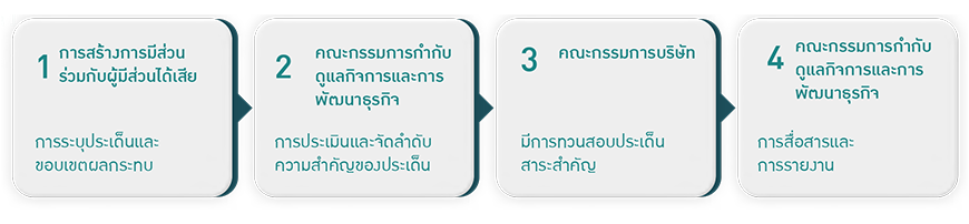 คณะกรรมการกำกับดูแลกิจการและการพัฒนาธุรกิจอย่างยั่งยืน ทบทวนข้อมูลจากตัวแทนของกลุ่มผู้มีส่วนได้เสีย รวมถึงกฎหมาย ข้อกำหนดลูกค้า การสร้างการมีส่วนและบริบทด้านความยั่งยืนด้านตามมิติเศรษฐกิจ สังคม สิทธิมนุษยชนและสิ่งแวดล้อมในประเด็นความเสี่ยง และโอกาสที่อาจส่งผลต่อผู้มีส่วนได้เสีย โดยนำเสนอประเด็นด้านความยั่งยืนที่มีนัยสำคัญต่อกลยุทธ์การดำเนินธุรกิจต่อคณะกรรมการบริษัท เพื่อทวนสอบ (Validation) ประเด็นสาระสำคัญ ซึ่งพิจารณาความถูกต้อง ความเหมาะสมและให้ความเห็นชอบตามนโยบายการพัฒนาอย่างยั่งยืนและบริบททางธุรกิจที่อาจเปลี่ยนแปลงไปในอนาคต