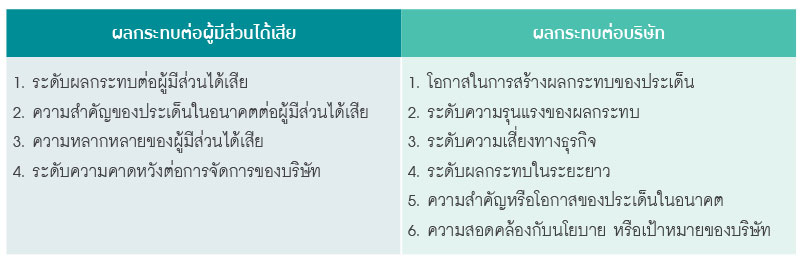 บริษัทพิจารณาลำดับประเด็นสาระสำคัญจากการประเมินความสำคัญของผลกระทบด้านเศรษฐกิจ สังคม สิทธิมนุษยชน และสิ่งแวดล้อม ที่มีต่อบริบทขององค์กรและผู้มีส่วนได้เสียครอบคลุมขอบเขตความท้าทายของผลกระทบ โอกาส กลยุทธ์ เป้าหมายการดำเนินการด้านความยั่งยืน และ นำประเด็นทั้งหมดมาจัดลำดับความสำคัญตามเกณฑ์โอกาสและความเสี่ยง โดยประเมินจากผลกระทบและความเป็นไปได้ที่มีนัยสำคัญต่อธุรกิจของบริษัท และ ปัญหาซึ่งผู้มี ส่วนได้ส่วนเสียให้ความสำคัญ โดยเทียบเคียงกับความสอดคล้องของตัวชี้วัดตามหลักการแนวทางการรายงานของ Global Reporting Initiative Standards (GRI Standards) และ เป้าหมายการพัฒนาที่ยั่งยืนของสหประชาชาติ (Sustainable Development Goals: SDGs) โดยใช้หลักเกณฑ์ดังนี้