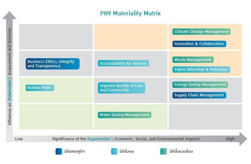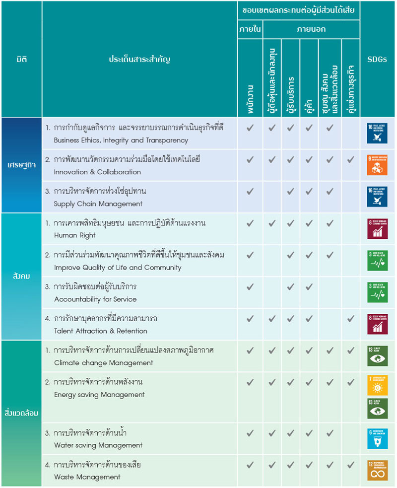 บริษัทระบุประเด็นสำคัญที่อาจส่งทั้งผลกระทบทั้งทางบวกและทางลบต่อการสร้างคุณค่าขององค์กรตลอดห่วงโซ่คุณค่าของธุรกิจ โดยพิจารณาจากบริบทภายในองค์กรและบริบทภายนอกองค์กรด้านต่าง ๆ อาทิ ทิศทางของอุตสาหกรรม พฤติกรรมของผู้บริโภคที่เปลี่ยนแปลง เศรษฐกิจ เทคโนโลยี สิ่งแวดล้อม การเมืองและกฎหมายที่เกี่ยวข้องกับผู้ส่วนได้เสีย ทุกกลุ่ม รวมถึงพิจารณาความเกี่ยวข้องกับวัตถุประสงค์และเป้าหมายการพัฒนาที่ยั่งยืนของธุรกิจครอบคลุมในมิติเศรษฐกิจ สังคม และสิ่งแวดล้อมตลอดในห่วงโซ่คุณค่าของธุรกิจ ควบคู่ไปกับการพิจารณาขอบเขตผลกระทบของประเด็นความสำคัญต่อกลุ่มผู้มีส่วนได้เสียทุกกลุ่ม ดังนี้