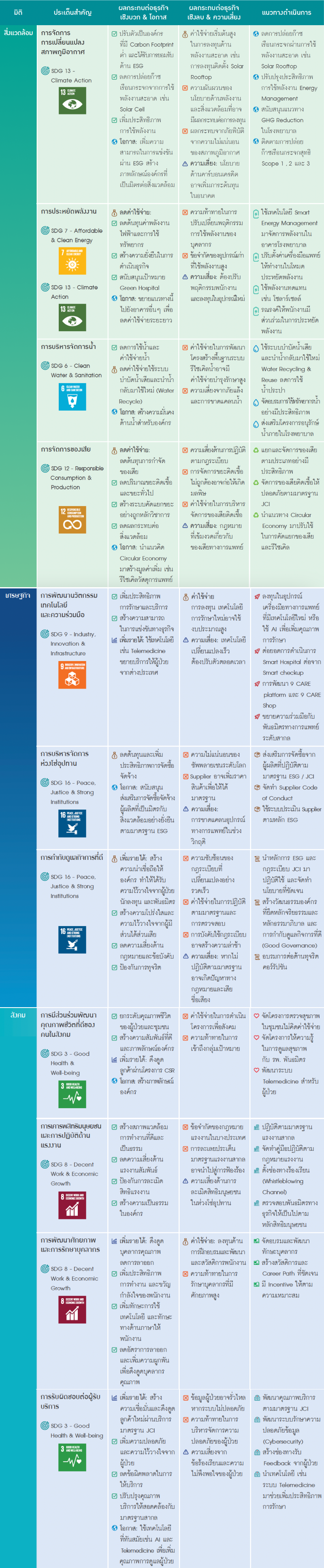 สำหรับประเด็นสำคัญของโรงพยาบาลพระรามเก้า จะมีการจัดลำดับความสำคัญและแนวทางในการดำเนินการ รวมถึงมีการนำมาวิเคราะห์ผลกระทบทั้งเชิงบวกและเชิงลบของประเด็นสำคัญต่อธุรกิจที่ก่อให้เกิดค่าใช้จ่าย รายได้ ความเสี่ยง การช่วยสร้างโอกาสทางธุรกิจ ของโรงพยาบาลพระรามเก้า การวิเคราะห์ประเด็นสำคัญ Impact and Material Topic Analysis จะทำให้ สามารถระบุโอกาสและความเสี่ยงได้อย่างชัดเจน รวมถึง วางแผนการดำเนินการที่เหมาะสมเพื่อสร้างความยั่งยืนและลดผลกระทบต่อสิ่งแวดล้อมและสังคมได้ ดังนี้
