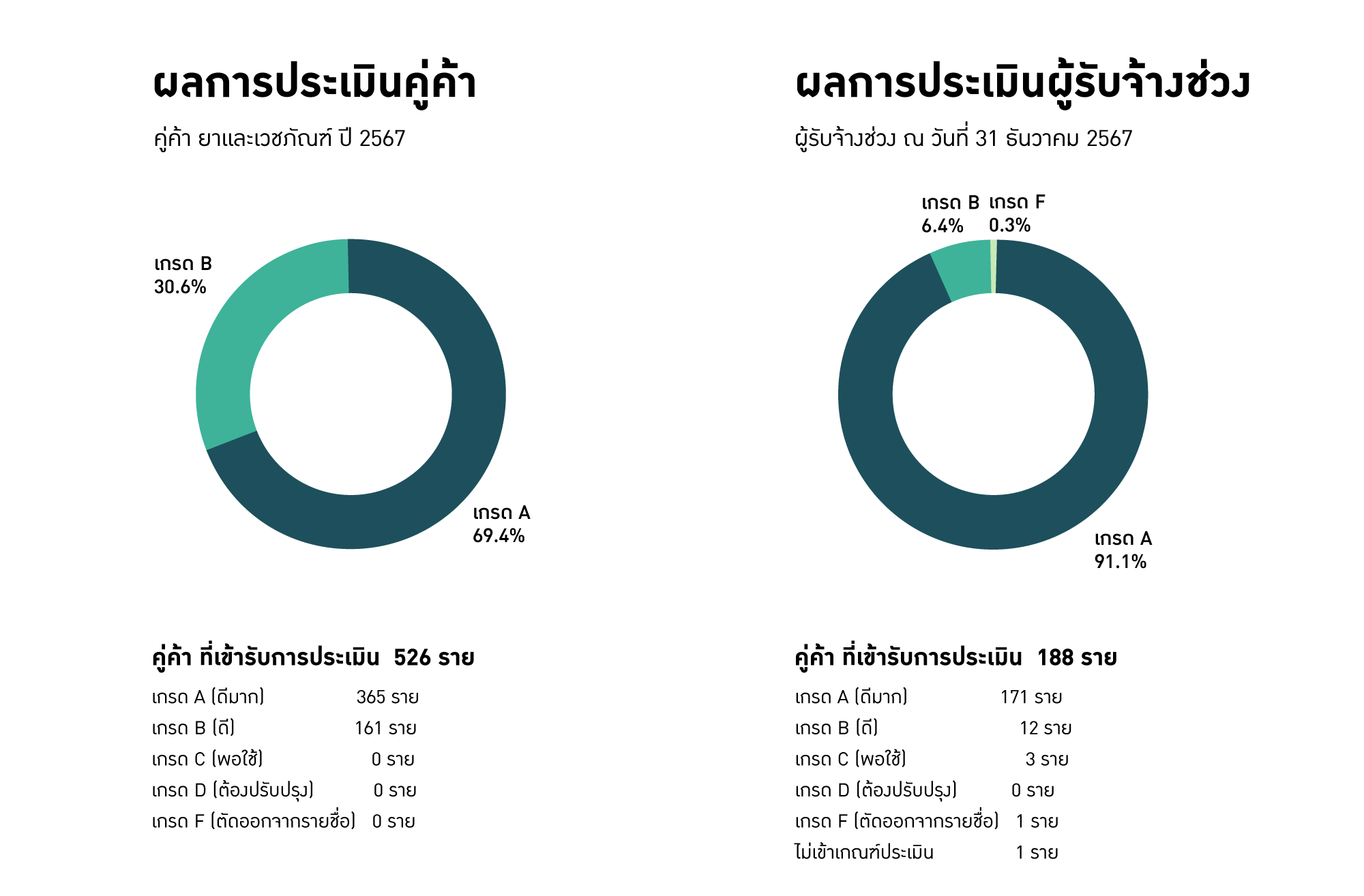 ผลการประเมินคู่ค้าประจำปี โดยพิจารณาการดำเนินการของคู่ค้าในห่วงโซ่อุปทาน ปี 2567 ซึ่งคู่ค้าส่วนใหญ่ ผลประเมินอยู่ในระดับ A ทั้งคู่ค้าในหมวดยาและเวชภัณฑ์ และ หมวดสินค้าทั่วไป